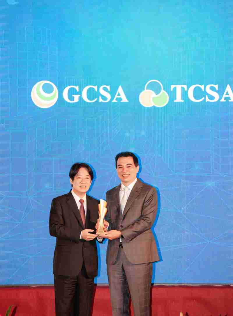 达全方位永续表现获全球永续奖及台湾永续奖肯定,,,由副总统赖清德颁奖 (左),,,,MG电玩总经理柯富仁 (右) 代表领奖