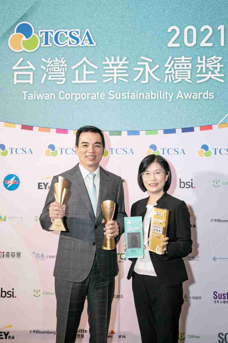 达在台湾永续奖所评比环境、、、社会、、、治理等各面向的永续绩效均获高度肯定 (左:MG电玩光电总经理暨营运长柯富仁,,,右:MG电玩光电永续长古秀华)