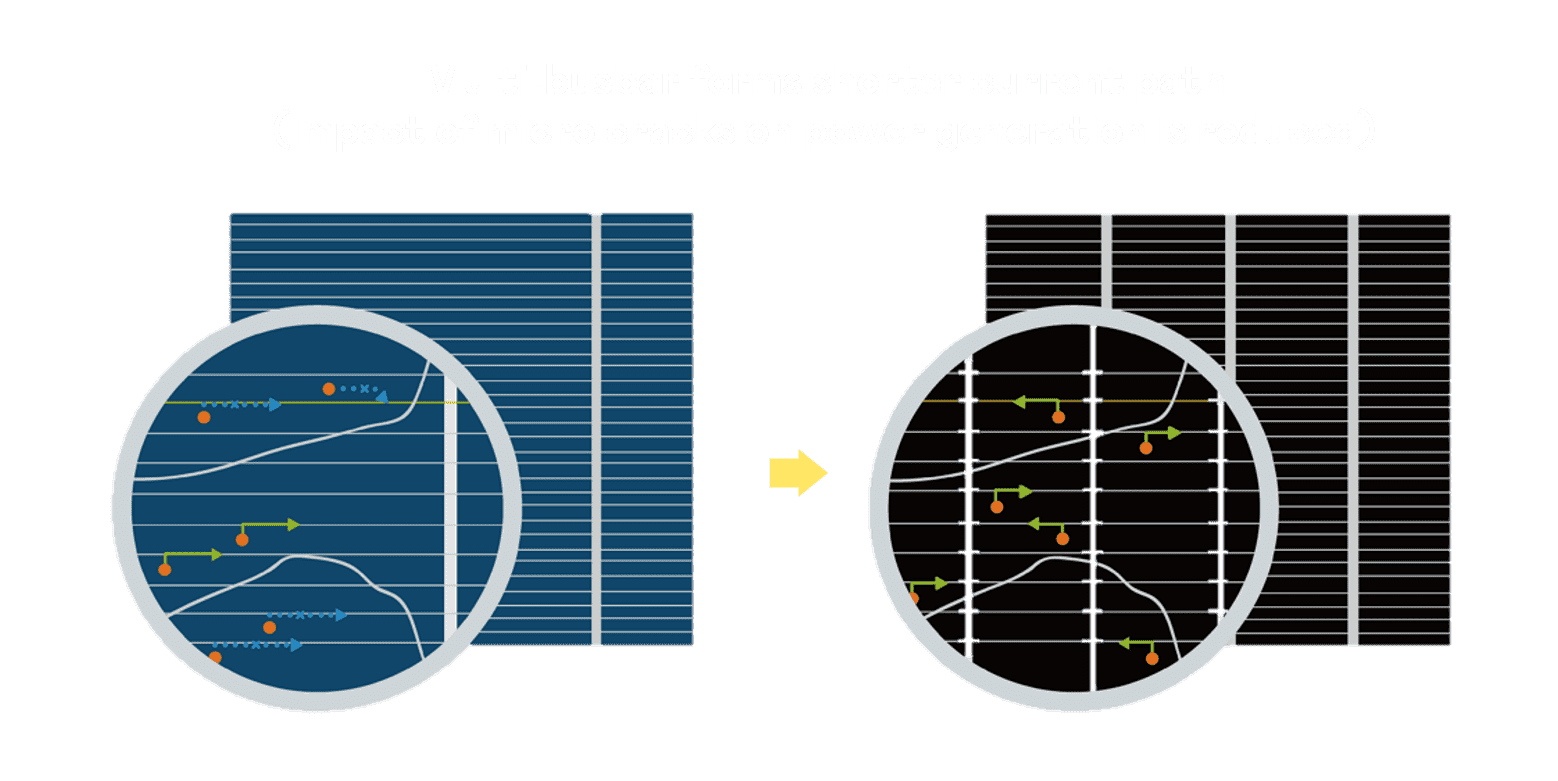 - 电池使用多条铜导线 (Copper wire) 于电池片上形成较短的电流路径,,提高电流收集效率,,采用圆形设计的铜导线较传统扁平式的铜焊带 (Ribbon),,,可增加入射至电池的光线量。。